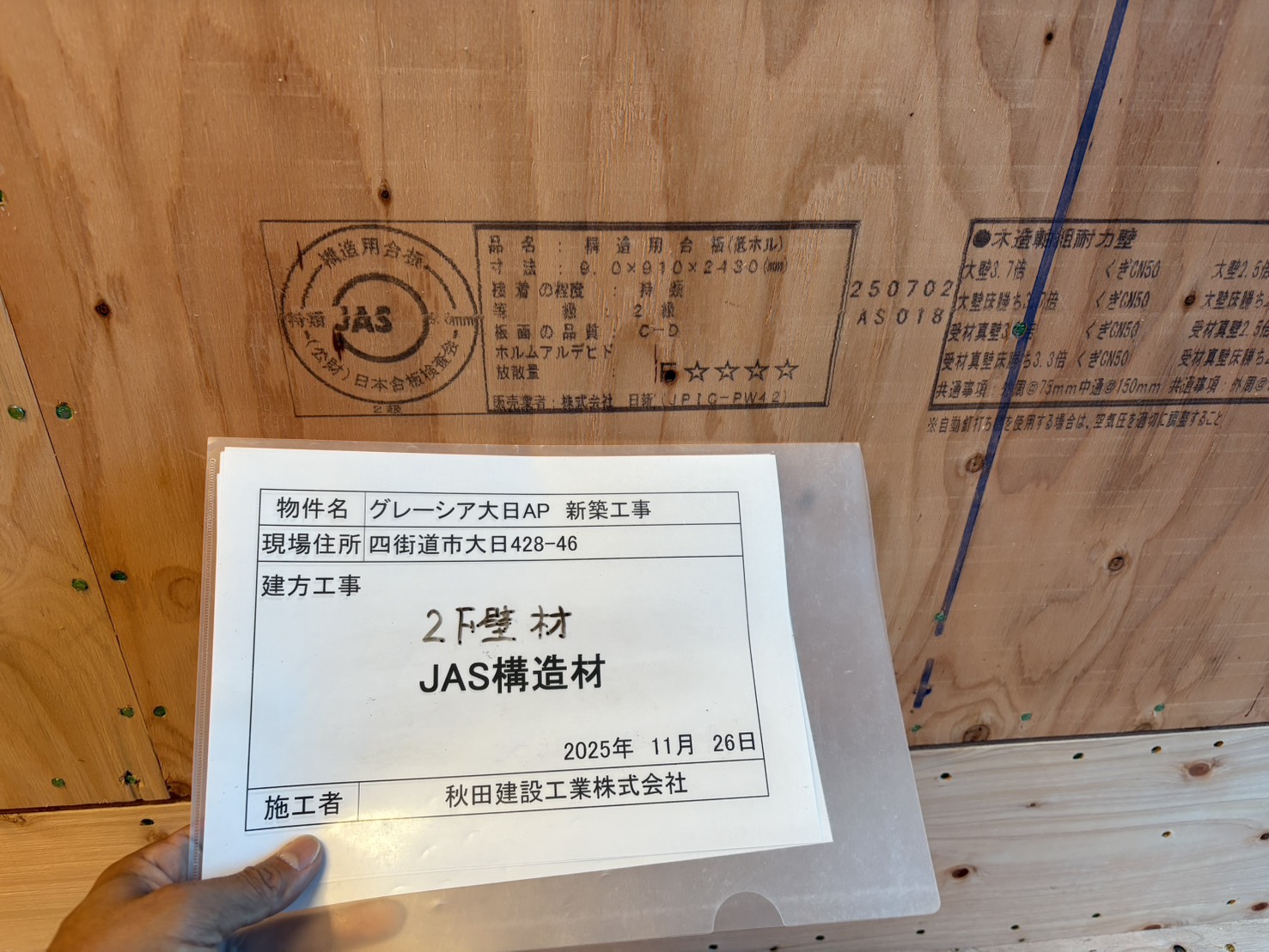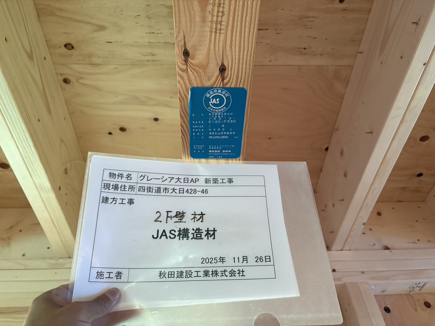 現場をご覧いただく際には「JAS構造材がつかわれているんだな」と想いを馳せていただけると嬉しいです。