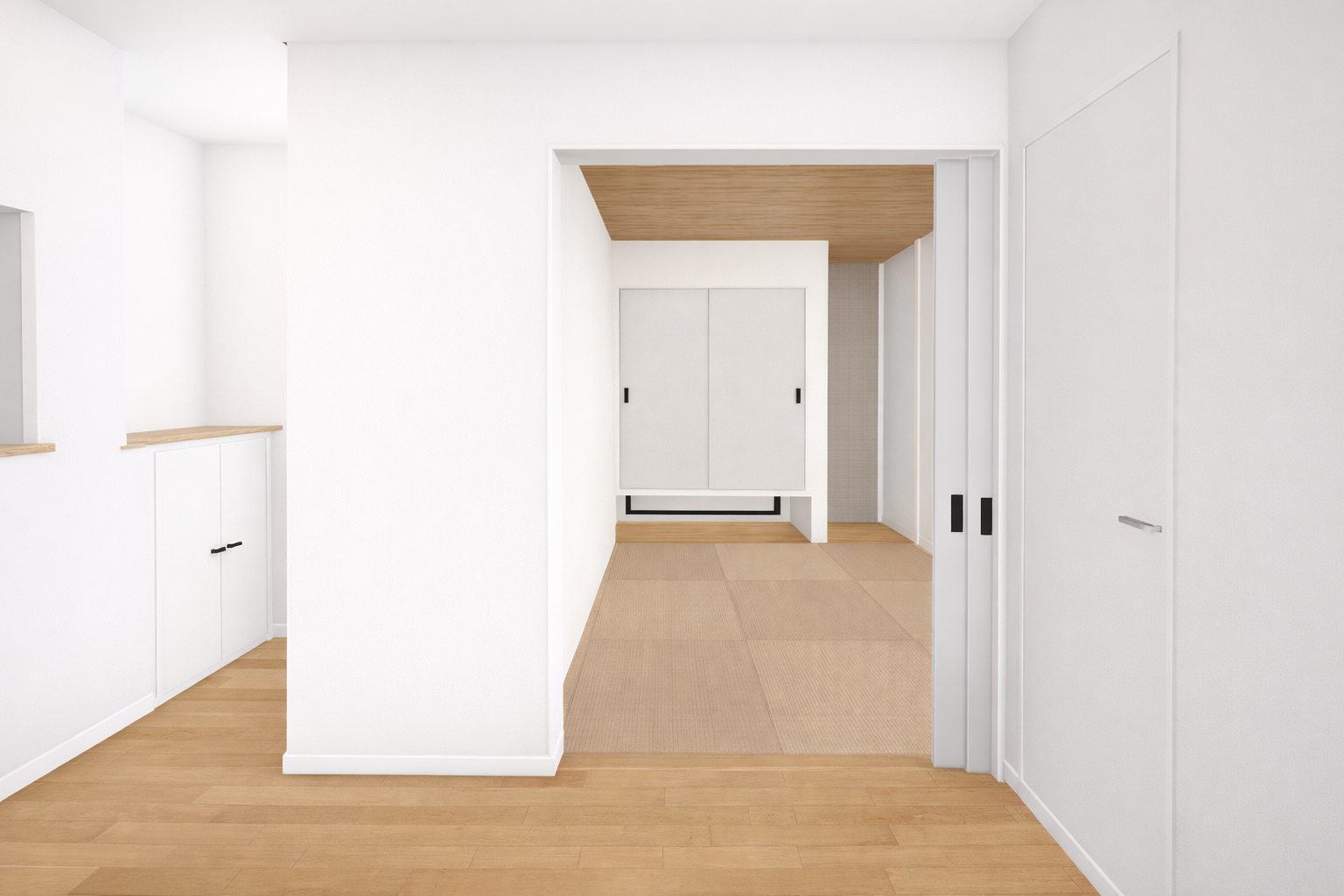 LDKに隣接した和室1部屋のある間取り。来客用やお子様のおもちゃコーナーなど和室はなにかと便利な空間。