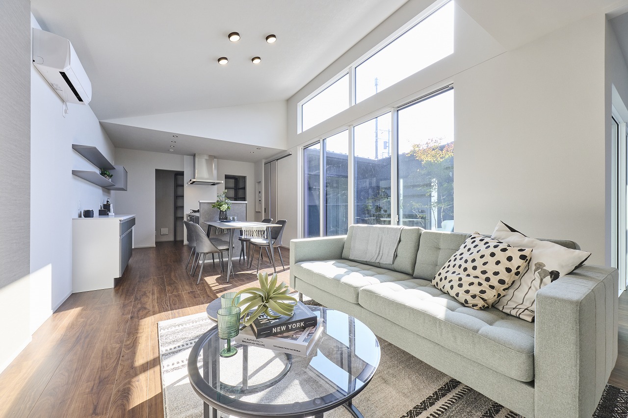 ・リビングは高天井の勾配天井で広々見える設計