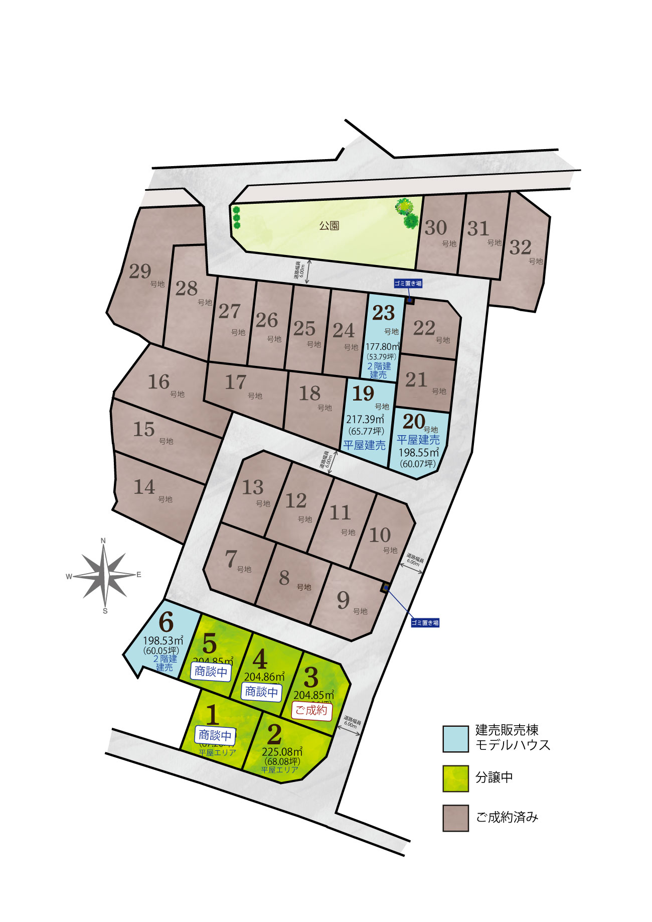注文住宅エリアは2階建て建築エリアと平屋建築エリアで分かれており、また6号地、19号地、23号地が 建売棟 となります。